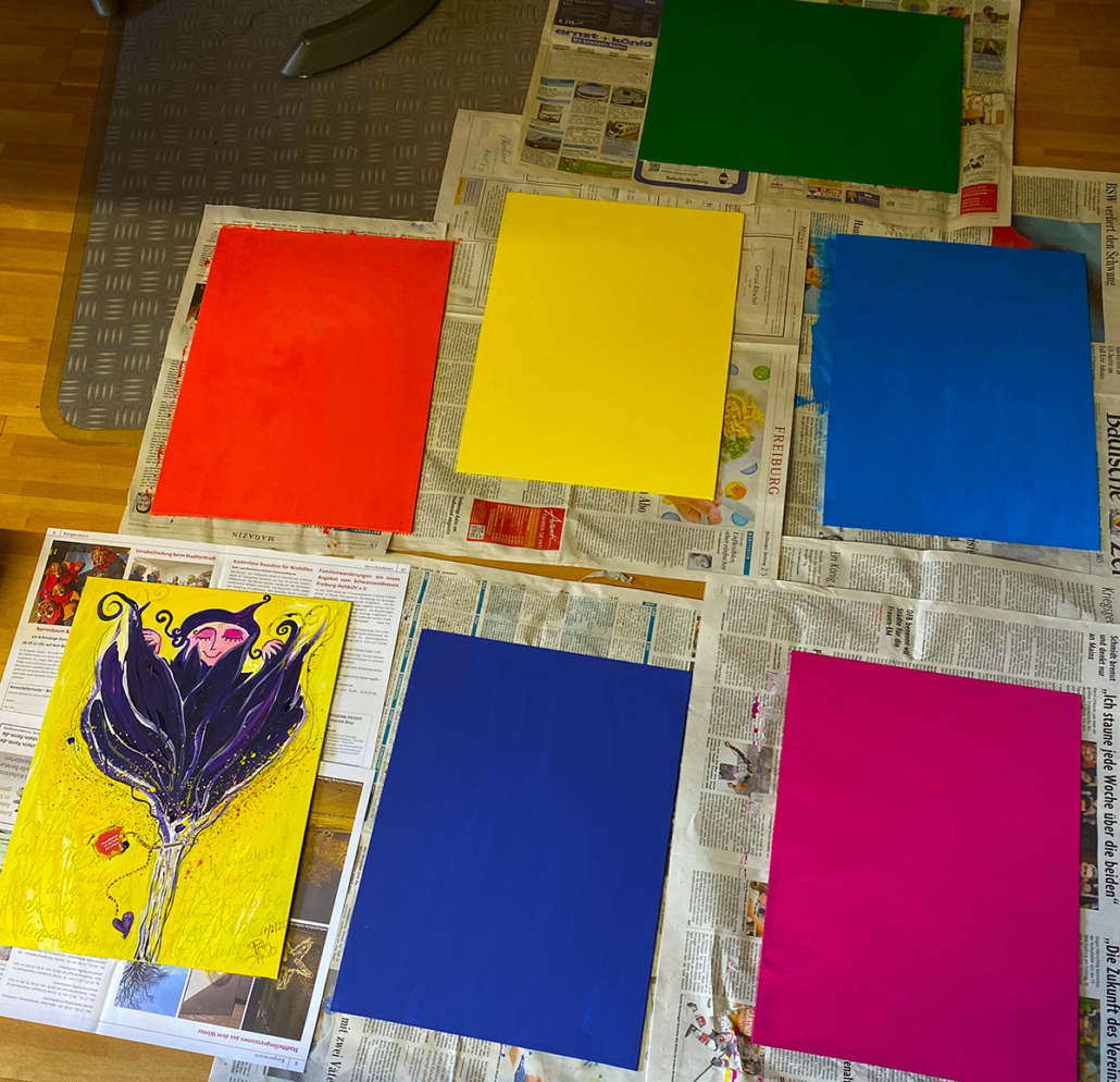 Wir arbeiten mit Gouachefarben der Firma Lefranc Bourgeois.