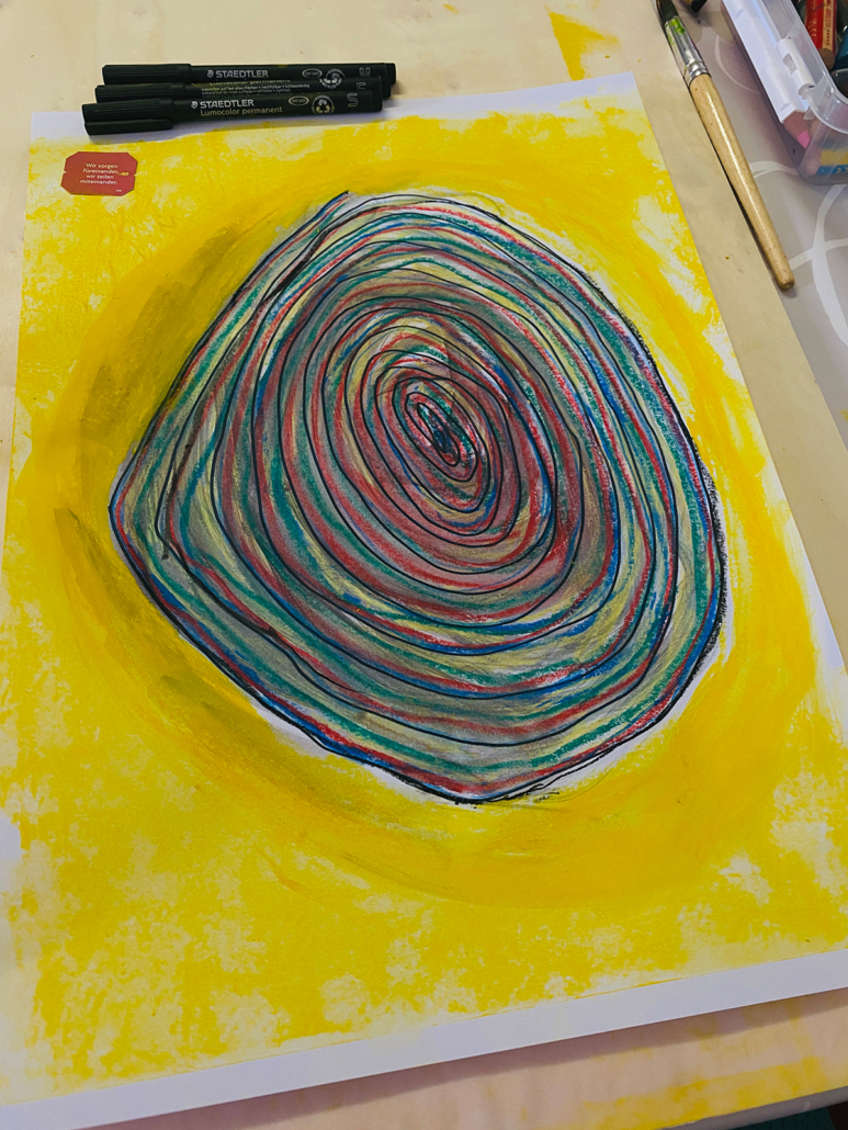 Dein Atem begleitet dich beim Gestalten – wie ein stiller Rhythmus, der dich führt und trägt. Die Spirale wird zur Bewegung nach innen und außen zugleich: Sie beruhigt, bündelt, belebt. Im Einreiben der Farbe verbinden sich Material, Körperwahrnehmung und Ausdruck zu einem spürbaren Ganzen. Aus dieser Verbindung heraus entstehen eigene Muster – aus dem Moment, aus dir selbst, im Fluss des Tuns.